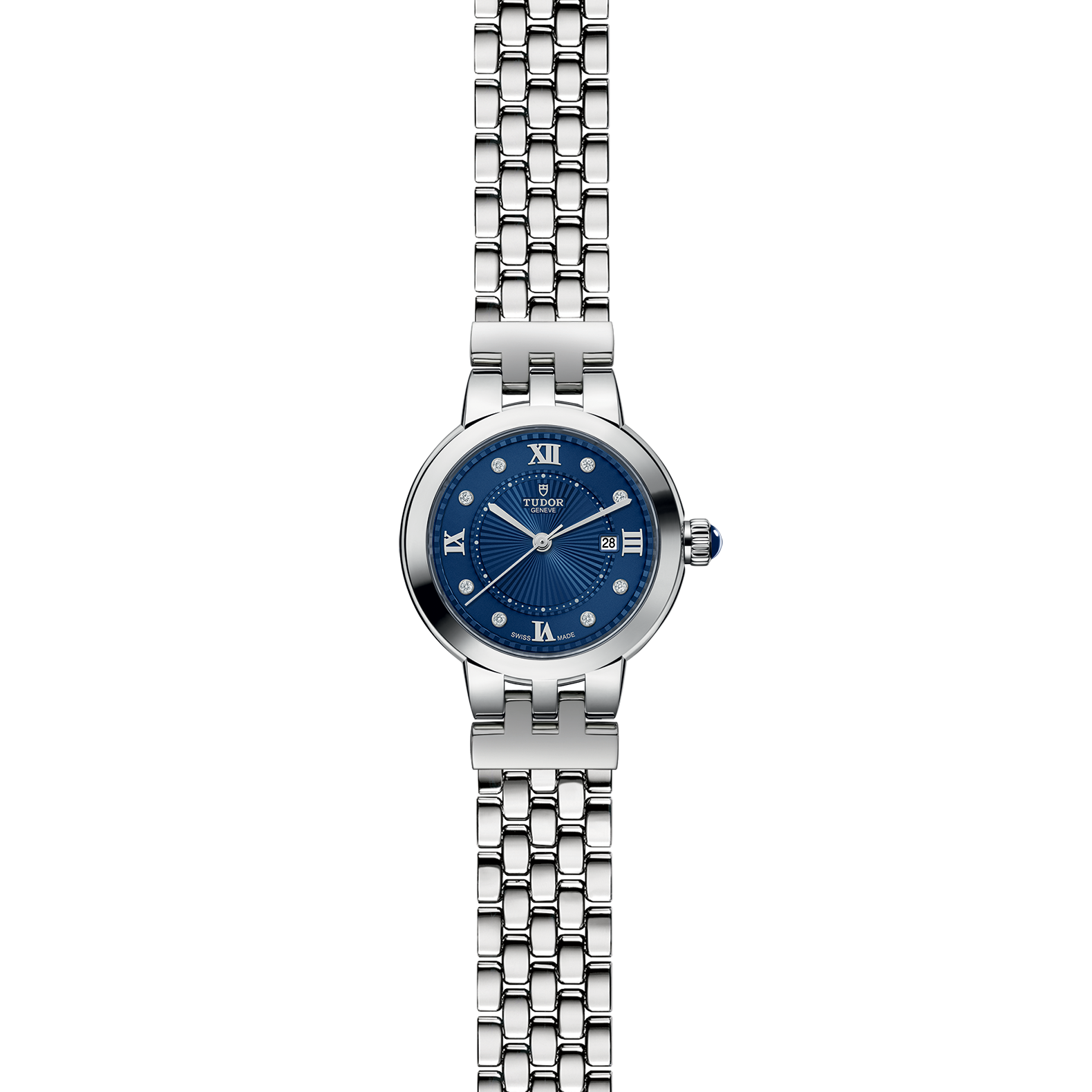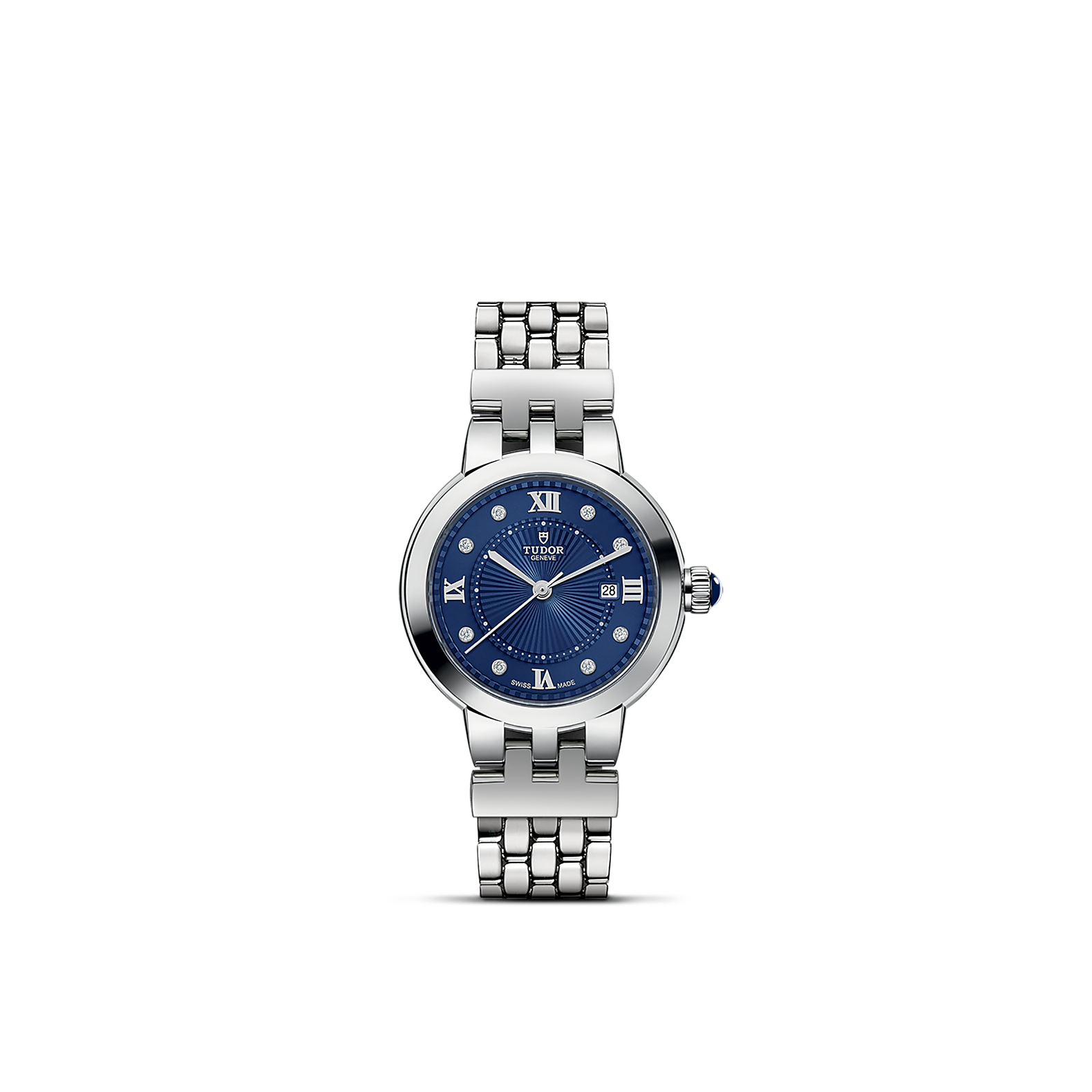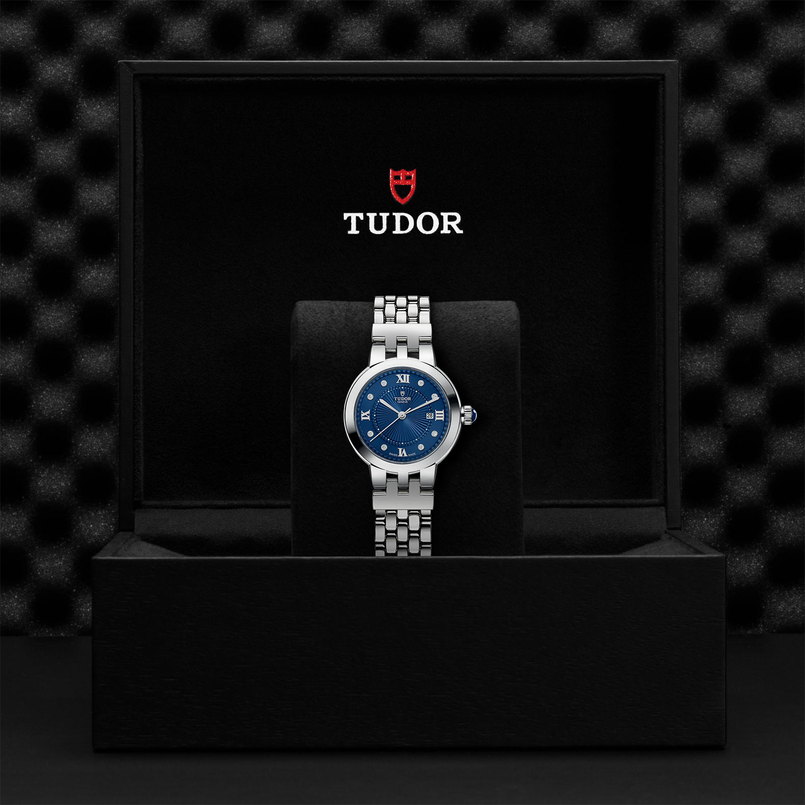 Available in three sizes, 26, 30 and 34 millimeters in diameter, it presents opaline and now “TUDOR Blue” dials with delicate decorations in relief, punctuated with Roman numerals or diamonds. Clair de Rose is fitted with a self-winding movement complete with date function and is available exclusively in stainless steel.