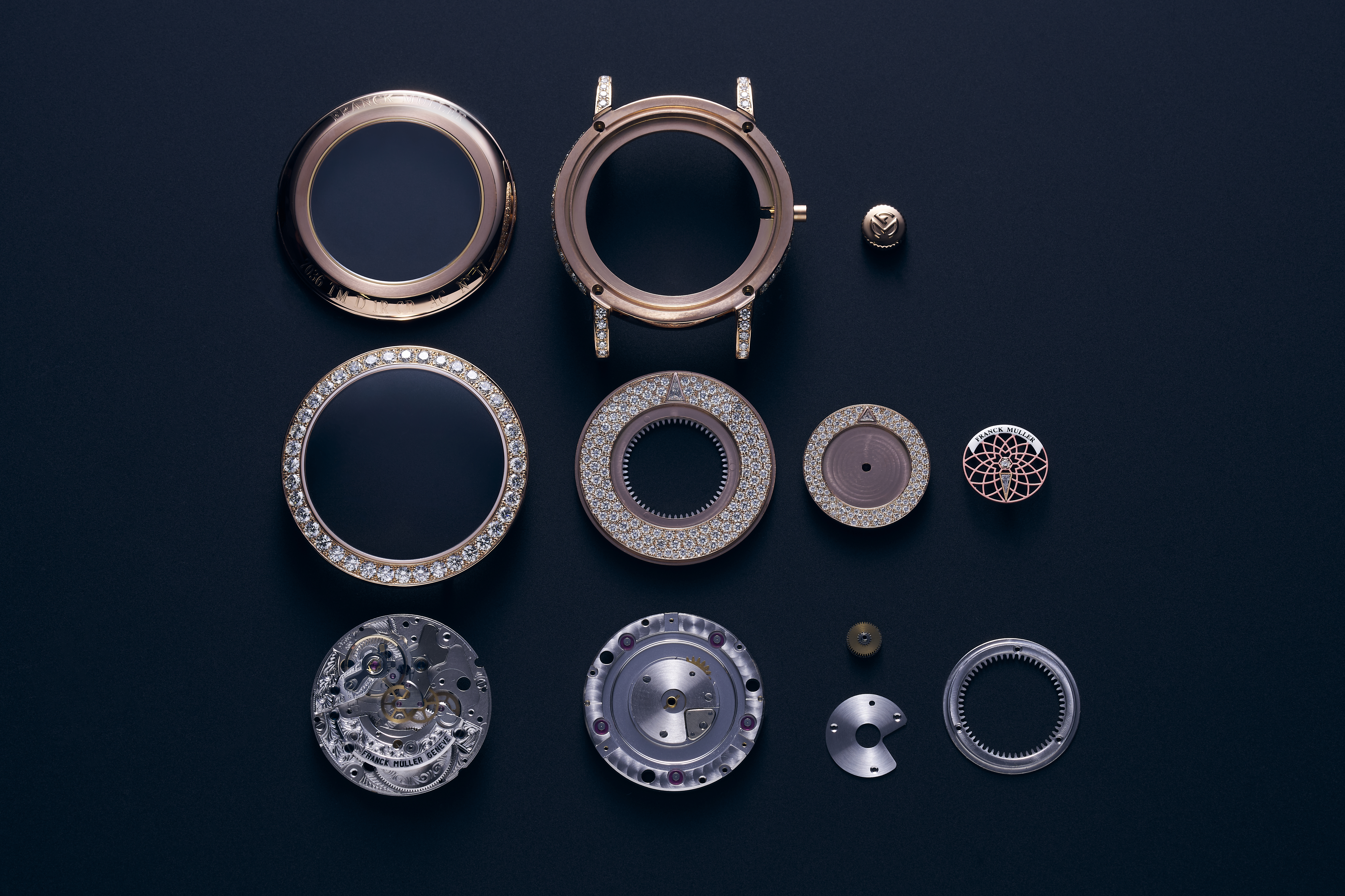 After extensive research and numerous testing of various materials, Franck Muller’s engineers chose aluminium as the optimal choice for the seconds disc, offering the ideal balance of lightness and rigidity for crafting the skeletonised central pastille. Machining this delicate component requires the highest level of precision due to its extremely thin design, with each bridge measuring just 0.3 mm in width, an extraordinary achievement in manufacturing.