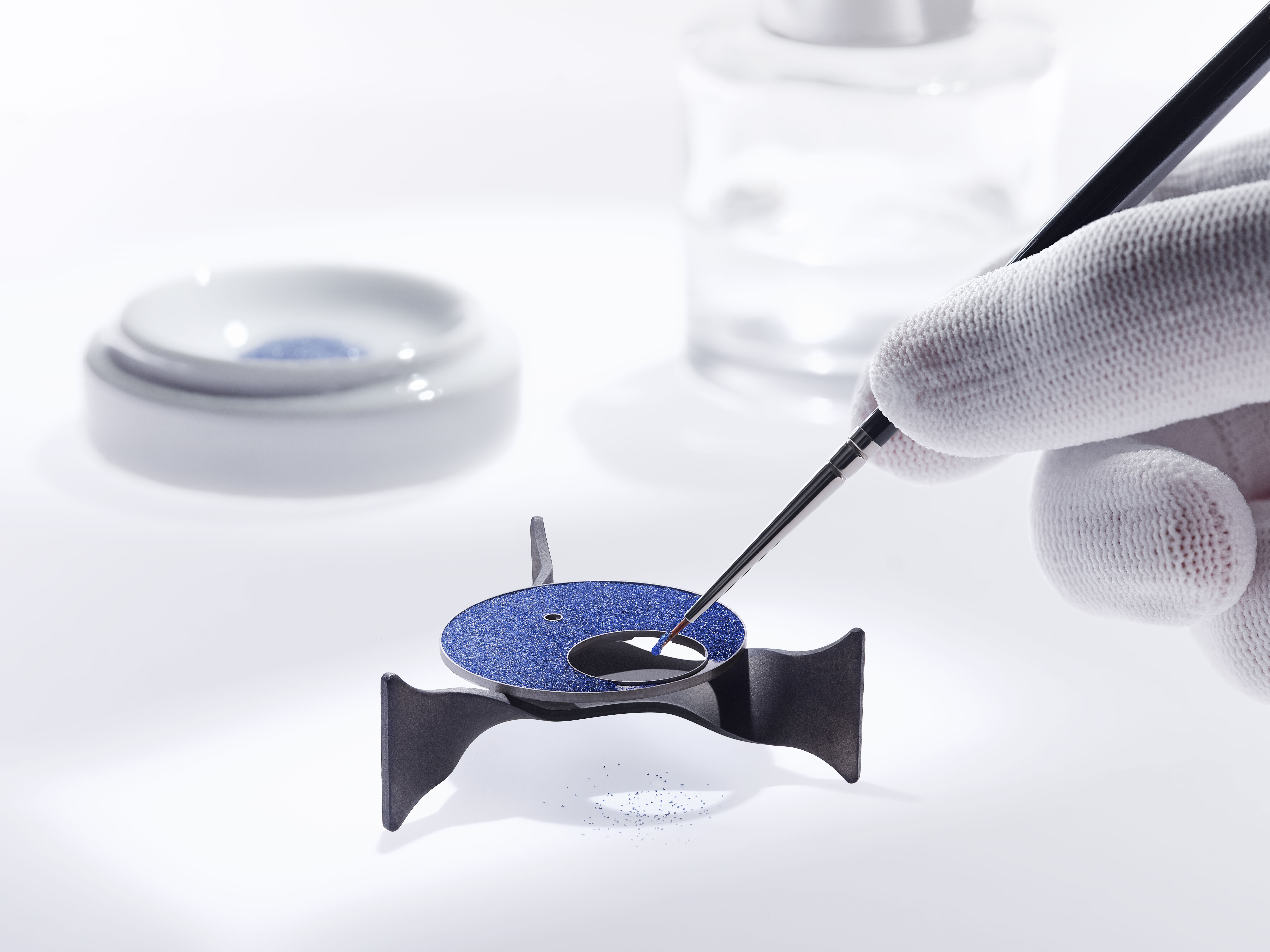 The art of aventurine dates back to the early 17th century and has been constantly perfected ever since. For this model, Breguet chose to work it like grand feu enamel. The glass must therefore be reduced to powder. The final compound must be finely calibrated – aventurine powder, for a perfect result, must have slightly larger grains than traditional enamel powder. At least five layers of aventurine are necessary to make this dial, each layer must be fired in a kiln at over 800 degrees Celsius. And each firing is highly sensitive and requires great precision: firing for too long, or at too high a temperature, can result in the dial being permanently compromised.