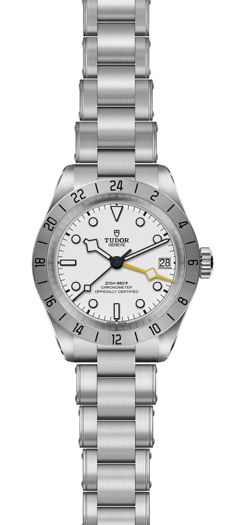 angular yellow “Snowflake” hand, an aesthetic hallmark of TUDOR, which completes a lap of the dial every 24 hours. Local time is indicated by another, shorter “Snowflake” hand set by a jumping hour, which can be moved either backwards or forwards. The date, displayed through an aperture positioned at 3 o’clock, is coupled with the local time hand so that when setting the time and passing midnight in retrograde, it instantly jumps to the previous day. A highly unusual, sophisticated and particularly practical function for the user.